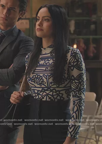 Veronica Lodge (played by Camila Mendes) on Riverdale on The CW was spotted wearing this white printed fitted top on Riverdale on episode 'The Town' (6x08) in Apr 2022. Veronica's Top is the Patterned Turtleneck Top by LA Double J . Veronica's Bag is the Carlyle medium shoulder bag by Kate Spade.