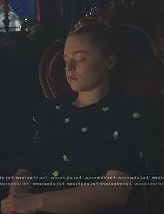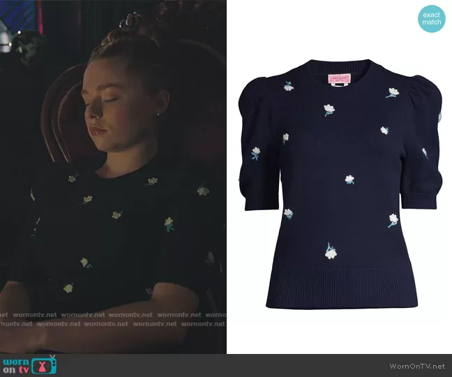 (played by ) on Riverdale on The CW was spotted wearing this navy floral embroidered short sleeve sweater on Riverdale on episode 'The Town' (6x08) in Apr 2022. 's Sweater is the Dainty Bloom Applique Sweater by Kate Spade.
