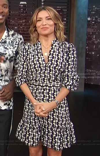 Kit Hoover on Access Hollywood on NBC was spotted wearing this black and white printed dress on Access Hollywood on Apr 04 2022's episode. Kit's Dress is the Printed Short Dress by Zara.