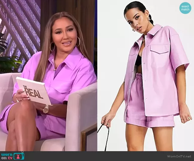 Adrienne Houghton on The Real on BETher was spotted wearing this pink leather shirt and shorts on The Real on Apr 04 2022's episode. Adrienne's Top is the Faux Leather Short Sleeve Shirt Jacket by Topshop . Adrienne's Shorts is the Faux Leather Jogger Shorts y Topshop.