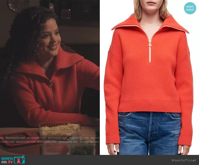 Maggie Vera (played by Sarah Jeffery) on Charmed on The CW was spotted wearing this red half zip sweater on Charmed on episode 'Ripples' (4x04) in Apr 2022. Maggie's Sweater is the Matelot Ribbed Wool Sweater by Maje.