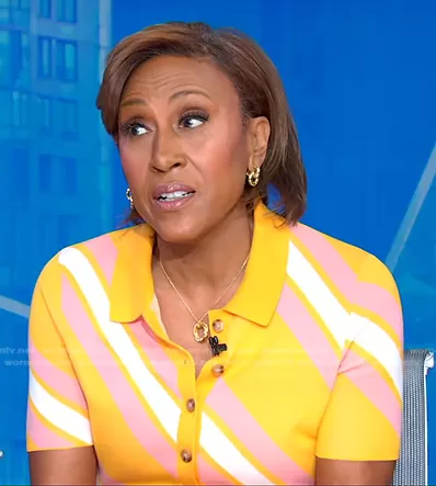 Robin Roberts on Good Morning America on ABC was spotted wearing this yellow, pink and white diagonal stripe dress on Good Morning America on Apr 05 2022's episode. Robin's Dress is the Aurelia Cut-Out Knit Shirtdress by Derek Lam 10 Crosby . Robin's Shoes is the Patent Calfskin Lang Sandals by Jimmy Choo.