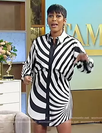 Tamron Hall on Tamron Hall Show on ABC was spotted wearing this black and white stripe mini shirtdress on Tamron Hall Show on Apr 05 2022's episode. Tamron's Dress is the Nouveau Striped Mini Shirtdress by Brandon Maxwell.