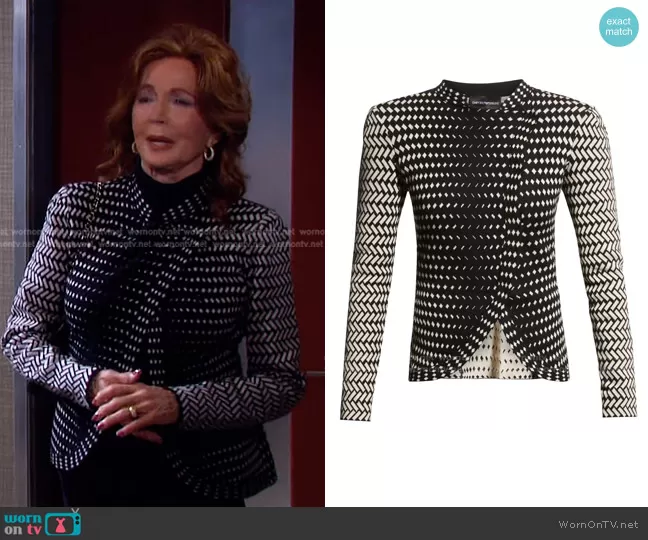 Maggie Horton (played by Suzanne Rogers) on Days of our Lives on Peacock was spotted wearing this black geometric jacket on Days of our Lives on Apr 06 2022's episode. Maggie's Jacket is the Knit Jacket with Asymmetrical Overlap by Emporio Armani.
