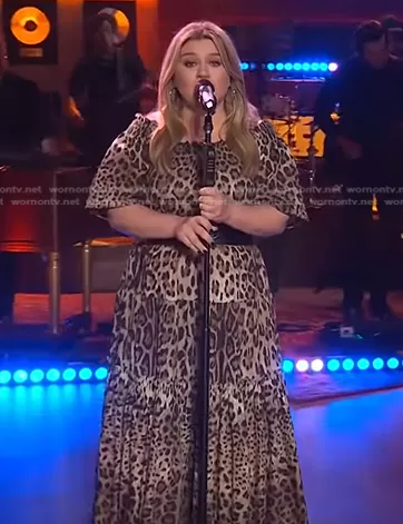 Kelly Clarkson on The Kelly Clarkson Show on NBC was spotted wearing this leopard off shoulder midi dress on The Kelly Clarkson Show on Apr 06 2022's episode. Kelly's Dress is the Leopard-Print Midi Dress by Dolce & Gabbana.