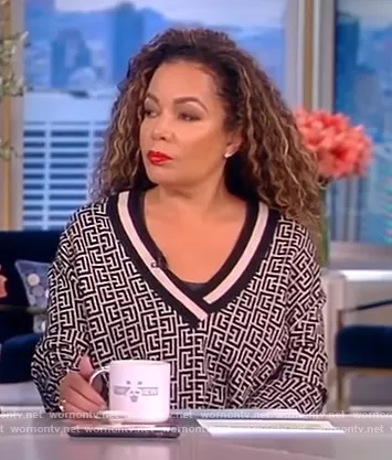 Sunny Hostin on The View on ABC was spotted wearing this monochrome v-neck sweater on The View on Apr 06 2022's episode. Sunny's Sweater is the Monogram Jacquard Merino Wool Blend Sweater by Balmain.