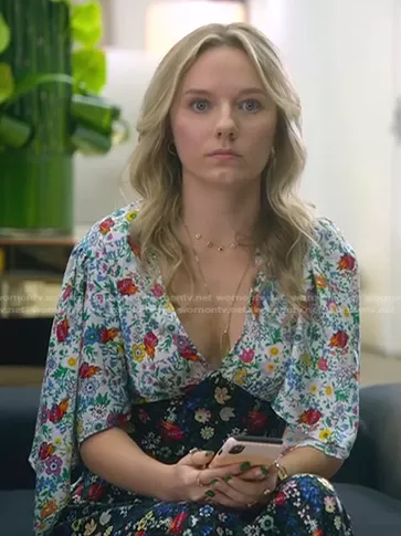 (played by ) on Good Trouble on Freeform was spotted wearing this mixed floral print dress on Good Trouble on episode 'So This is What the Truth Feels Like' (4x05) in Apr 2022. 's Dress is the Idol Mixed Print Midi Dress by Topshop.