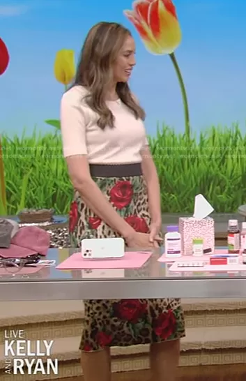 on Live with Kelly and Mark on Disney ABC Home Entertainment was spotted wearing this leopard floral skirt on Live with Kelly and Ryan on Apr 06 2022's episode. 's Skirt is the Rose & Leopard Print Cady Skirt by Dolce & Gabbana.