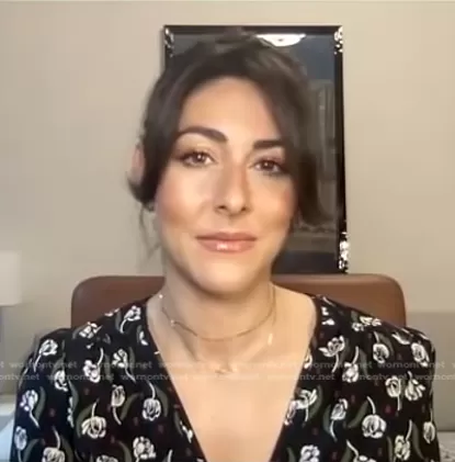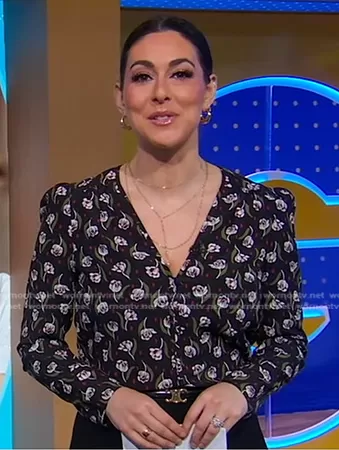 Erielle Reshef on Good Morning America on ABC was spotted wearing this black floral blouse on Good Morning America on Oct 17 2024's episode. Erielle's Top is the Ashville Blouse by Veronica Beard.