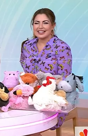 Bobbie Thomas on Today on NBC was spotted wearing this purple butterfly print shirtdress on Today on Apr 07 2022's episode. Bobbie's Dress is the Addison Butterfly-Print Shirtdress by L'Agence.