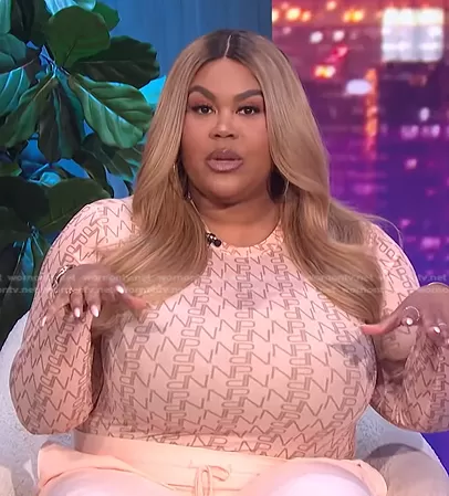 Nina Parker on E! News on E! was spotted wearing this pink logo print top and wide-leg pants on E! News Nightly Pop on Apr 07 2022's episode. Nina's Bodysuit is the Trendy Plus Size Mesh Bodysuit by Nina Parker . Nina's Pants is the Trendy Plus Size Satin-Trim Wide-Leg Pants by Nina Parker.
