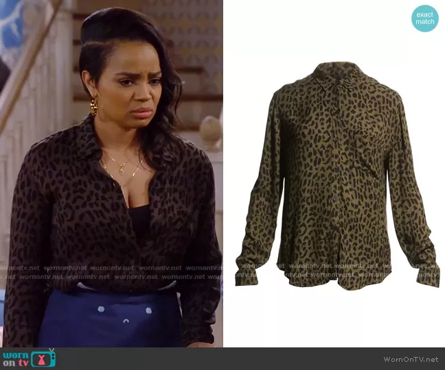 Randi (played by Kyla Pratt) on Call Me Kat on Fox was spotted wearing this olive leopard print shirt on Call Me Kat on episode 'Call Me Cupid' (2x14) in Apr 2022. Randi's Top is the Hunter Shirt in Forest Black Cheetah by Rails.