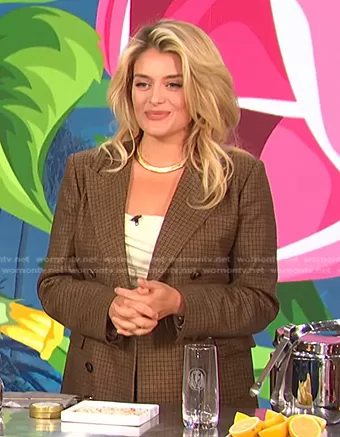 on E! News on E! was spotted wearing this brown check blazer on E! News Daily Pop on Apr 06 2022's episode. 's Top is the Jaida Crop Top by Camila Coelho . 's Jacket is the Checked stretch-wool blazer by Etro.