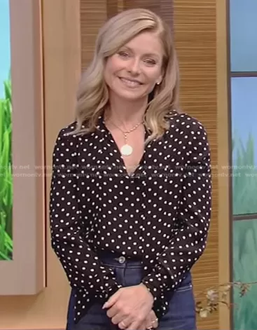 Kelly Ripa on Live with Kelly and Mark on Disney ABC Home Entertainment was spotted wearing this black polka dot blouse and jeans on Live with Kelly and Ryan on Apr 08 2022's episode. Kelly's Top is the Polka Dot Silk Georgette Blouse by Valentino . Kelly's Pants is the Leather-Patch High-Rise Flared Jeans by Paco Rabanne.