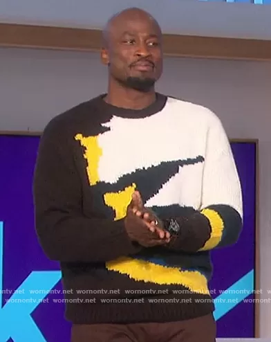 Akbar Gbajabiamila on The Talk on CBS was spotted wearing this Akbar abstract knit sweater on The Talk on Apr 08 2022's episode. Akbar's Sweater is the Tictoc Multicolor Knit Sweater by Dries Van Noten.