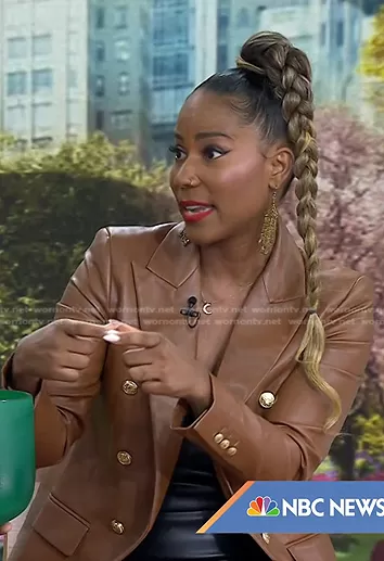 on Today on NBC was spotted wearing this brown leather blazer on Today on Apr 08 2022's episode. 's Jacket is the Buttoned Faux Leather Blazer by Zara.