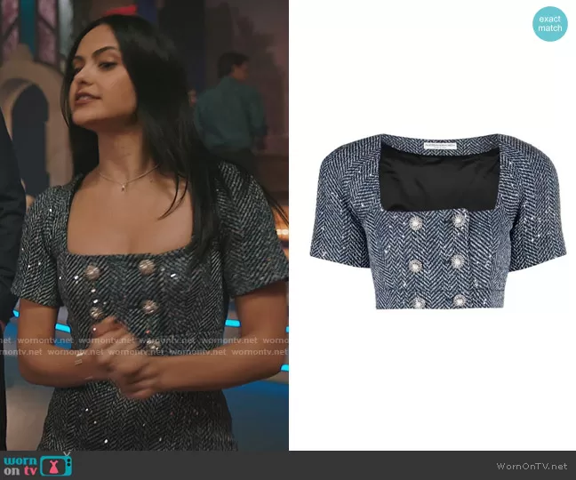 Veronica Lodge (played by Camila Mendes) on Riverdale on The CW was spotted wearing this blue tweed crop top and skirt on Riverdale on episode 'The Serpent Queen's Gambit' (6x09) in Apr 2022. Veronica's Top is the Cropped Double-breasted Blazer by Alessandra Rich . Veronica's Skirt is the Sequin-Embellished Pencil Skirt by Alessandra Rich.