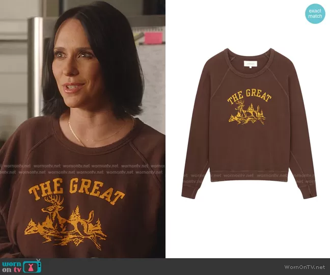 Maddie Kendall (played by Jennifer Love Hewitt) on 9-1-1 on Fox was spotted wearing this brown deer print sweatshirt on 9-1-1 on episode 'Fear-o-Phobia' (5x13) in Apr 2022. Maddie's Sweater is the The College Sweatshirt by The Great.