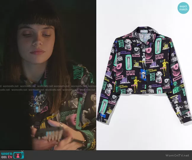 Mencia Blanco (played by Martina Cariddi) on Elite on Netflix was spotted wearing this Mencia’s black graphic print shirt on Elite on episode 'Anything Goes' (5x02) in Apr 2022. Mencia's Top is the Cropped Printed Shirt by Bershka .
