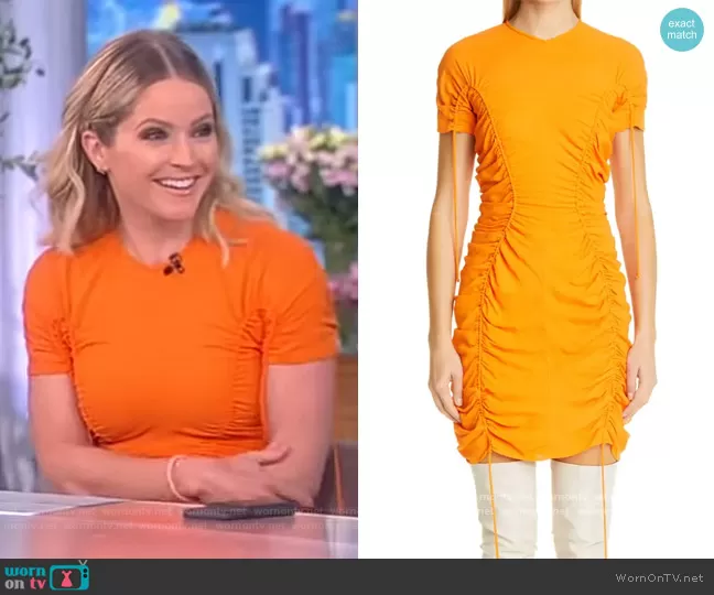 Sara Haines on The View on ABC was spotted wearing this orange ruched mini dress on The View on Apr 12 2022's episode. Sara's Dress is the Ruched Body-Con Jersey Minidress by Stella McCartney.