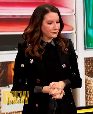on The Drew Barrymore Show on CBS was spotted wearing this black jewel embellished blazer on The Drew Barrymore Show on Apr 12 2022's episode. 's Blazer is the Ditsy Khloe Embellished Blazer by Cinq a Sept.