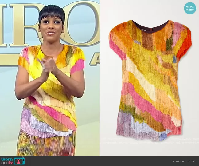 Tamron Hall on Tamron Hall Show on ABC was spotted wearing this multicolored fringe top and skirt on Tamron Hall Show on Apr 12 2022's episode. Tamron's Top is the Fringe Short-Sleeve Top by Dries Van Noten . Tamron's Skirt is the Draped printed crochet-knit skirt by Dries Van Noten.