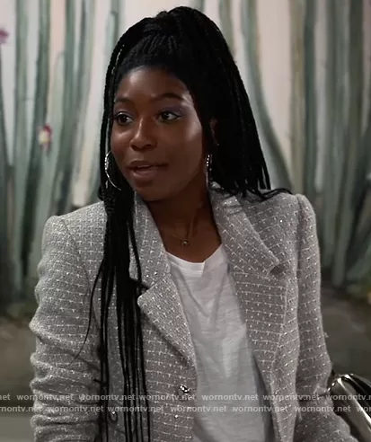 Trina Robinson (played by Tabyana Ali) on General Hospital on ABC was spotted wearing this gray checked tweed blazer on General Hospital on Apr 13 2022's episode. Trina's Blazer is the Cropped Tweed Jacket by Express.