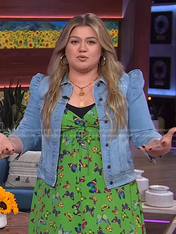 Kelly Clarkson on The Kelly Clarkson Show on NBC was spotted wearing this green butterfly print dress and puff sleeve denim jacket on The Kelly Clarkson Show on Apr 13 2022's episode. Kelly's Dress is the Sachi Butterfly Print Maxi-Dress by L'Agence . Kelly's Jacket is the Ada Puff-Sleeve Denim Jacket by Retrofete.