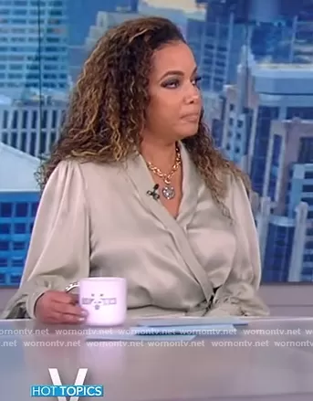Sunny Hostin on The View on ABC was spotted wearing this green satin wrap dress on The View on Apr 13 2022's episode. Sunny's Dress is the Asymmetric ruffled silk-satin wrap dress by Zimmermann.