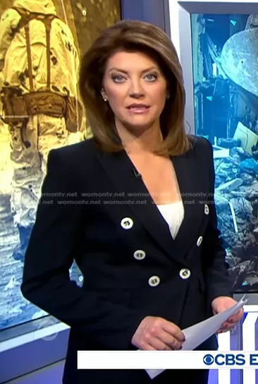 Norah O'Donnell on CBS Evening News on CBS was spotted wearing this navy double breasted blazer on CBS Evening News on Jul 29 2023's episode. Norah's Jacket is the Miller Dickey Jacket by Veronica Beard.