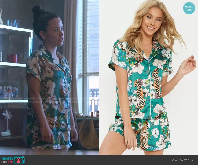 Mariana Foster (played by Cierra Ramirez) on Good Trouble on Freeform was spotted wearing this green tiger and floral print pajamas on Good Trouble on episode 'Something Unpredictable, but in the End It's Right' (4x06) in Apr 2022. Mariana's Pajama Set is the Tiger Blossom Short Satin PJ Set by Pretty Little Thing.