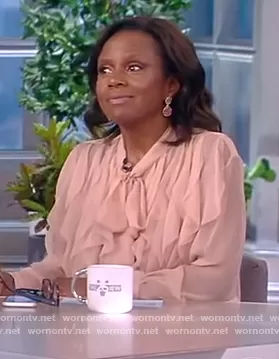 on The View on ABC was spotted wearing this Deborah Roberts’ pink ruffle blouse on The View on Apr 14 2022's episode. 's Top is the Sheer long-sleeve blouse by Valentino.