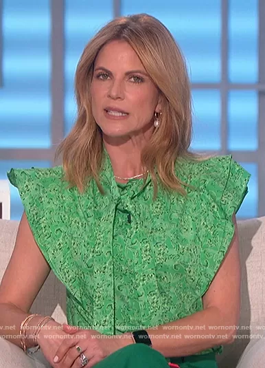 Natalie Morales on The Talk on CBS was spotted wearing this green printed ruffle top on The Talk on Apr 14 2022's episode. Natalie's Top is the Nora Ruffle Blouse by Derek Lam 10 Crosby.