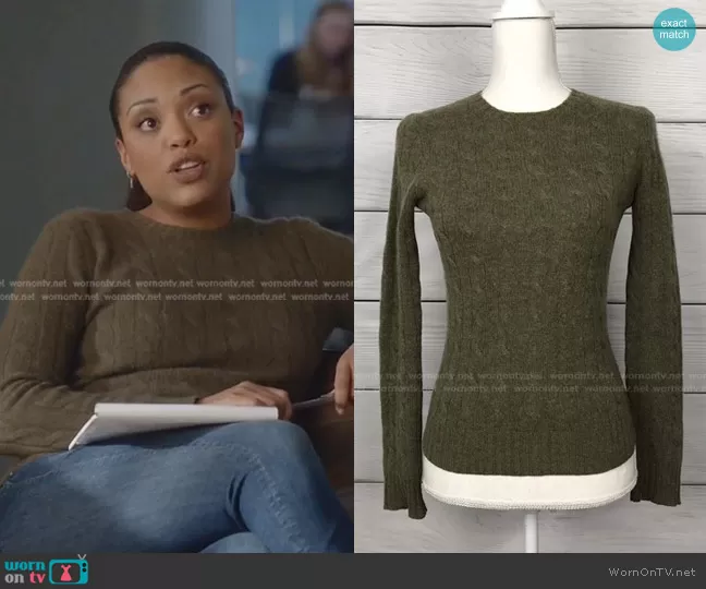 Danny James (played by Jaime Lee Kirchner) on Bull on CBS was spotted wearing this khaki green cable knit sweater on Bull on episode 'Dark Horse' (6x17) in Apr 2022. Danny's Sweater is the Cashmere Cable Knit Sweater in Hunter Green by Polo Ralph Lauren.