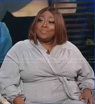 Loni Love on E! News on E! was spotted wearing this grey wrap jumpsuit on E! News Daily Pop on Apr 15 2022's episode. Loni's Jumpsuit is the Relaxed Shawl Collar Jumpsuit by Eloquii.