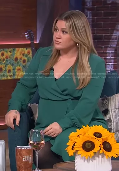Kelly Clarkson on The Kelly Clarkson Show on NBC was spotted wearing this green collared wrap dress on The Kelly Clarkson Show on Apr 15 2022's episode. Kelly's Dress is the Collared Wrap Midi Dress with Tie Belt by Asos.
