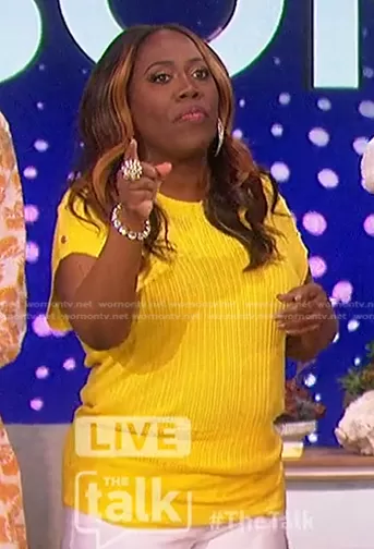 Sheryl Underwood on The Talk on CBS was spotted wearing this yellow button-shoulder top on The Talk on Apr 18 2022's episode. Sheryl's Top is the Ribbed-Knit Batwing-Sleeve Sweater by INC International Concepts.