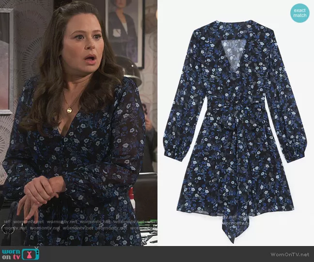 Jen (played by Katie Lowes) on How We Roll on CBS was spotted wearing this blue floral print mini dress on How We Roll on episode 'The Sponsor' (1x02) in Apr 2022. Jen's Dress is the Floral Print Tie Waist Dress by The Kooples.