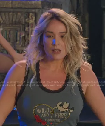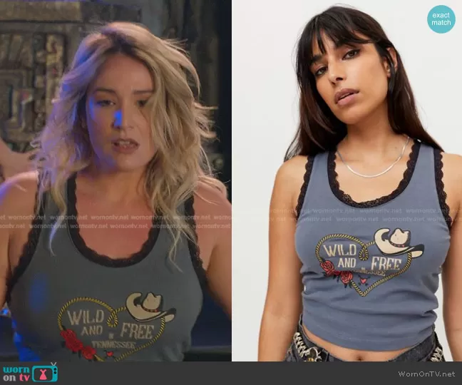 Davia (played by Emma Hunton) on Good Trouble on Freeform was spotted wearing this grey Wide and Free print tank on Good Trouble on episode 'Take These Chances' (4x07) in Apr 2022. Davia's Top is the Wild And Free Lace Trim Tank Top by Urban Outfitters.