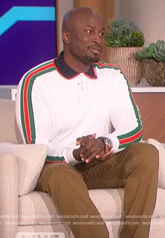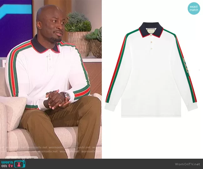 Akbar Gbajabiamila on The Talk on CBS was spotted wearing this white sleeve stripe polo on The Talk on Apr 21 2022's episode. Akbar's Shirt is the Cotton polo with Gucci stripe white by Gucci.