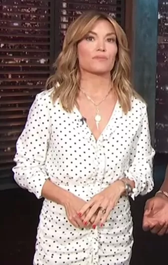 Kit Hoover on Access Hollywood on NBC was spotted wearing this white polka dot ruched dress on Access Hollywood on Apr 28 2022's episode. Kit's Dress is the Draped Dress with Gathered Detail by Zara.