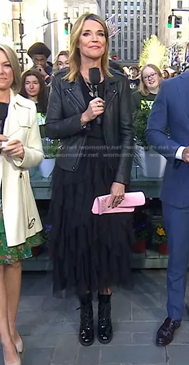Savannah Guthrie on Today on NBC was spotted wearing this black tiered tulle skirt on Today on Apr 22 2022's episode. Savannah's Skirt is the Ruffled Tulle Midi Skirt by Anthropologie.