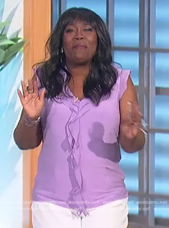 Sheryl Underwood on The Talk on CBS was spotted wearing this lavender ruffle front top on The Talk on Jul 28 2022's episode. Sheryl's Top is the Ruffled Sleeveless Blouse by Tommy Hilfiger.