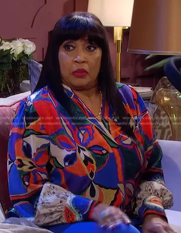 Paulina Price (played by Jackée Harry) on Days of our Lives on Peacock was spotted wearing this printed blouse on Days of our Lives on Apr 23 2022's episode. Paulina's Top is the Jojo Silk Blouse by Kobi Halperin.