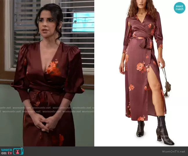 Sam McCall (played by Kelly Monaco) on General Hospital on ABC was spotted wearing this burgundy floral wrap dress on General Hospital on Apr 25 2022's episode. Sam's Dress is the Merrick Long Sleeve Floral Dress by Reformation.