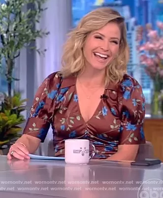 Sara Haines on The View on ABC was spotted wearing this brown floral ruched dress on The View on Apr 25 2022's episode. Sara's Dress is the Ruched Mini Dress by Ganni.