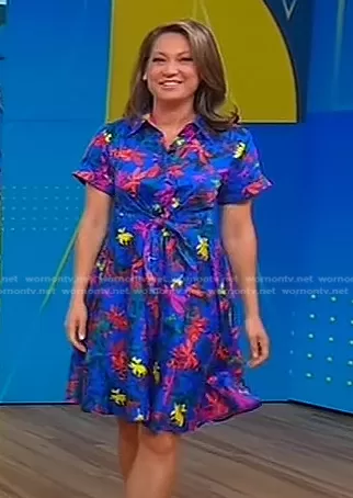 Ginger Zee on Good Morning America on ABC was spotted wearing this blue floral tie waist dress on Good Morning America on Apr 25 2022's episode. Ginger's Dress is the Albus Short-Sleeved Mini Dress by Diane von Furstenberg.