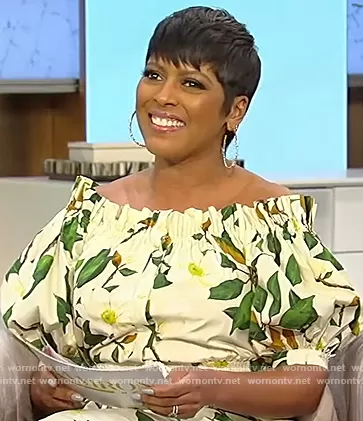 Tamron Hall on Tamron Hall Show on ABC was spotted wearing this floral print off shoulder jumpsuit on Tamron Hall Show on Apr 25 2022's episode. Tamron's Jumpsuit is the Cotton-blend jumpsuit by Oscar de la Renta.