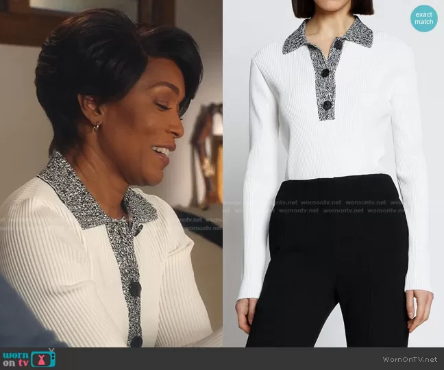 Athena Grant (played by Angela Bassett) on 9-1-1 on ABC was spotted wearing this white marl-trim top on 9-1-1 on episode 'FOMO' (5x15) in Apr 2022. Athena's Top is the Matte Viscose Knit Top by Proenza Schouler.