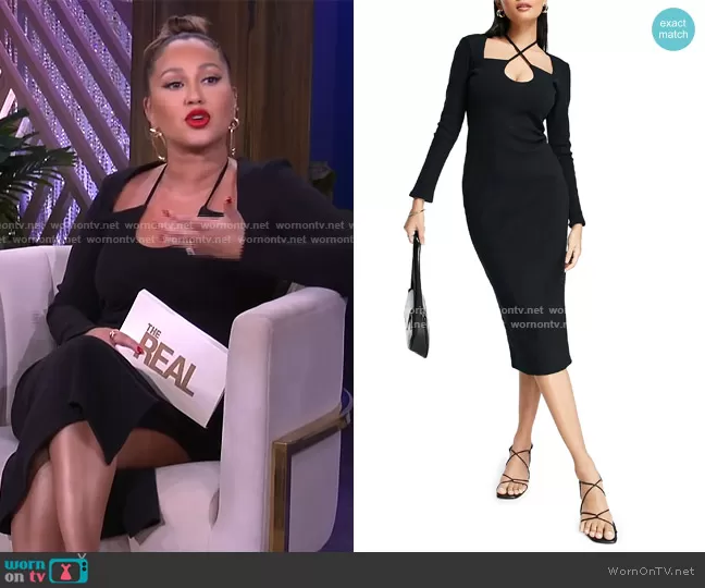 Adrienne Houghton on The Real on BETher was spotted wearing this black cross neck dress on The Real on Apr 25 2022's episode. Adrienne's Dress is the Ribbed Jersey Body-Con Dress by Topshop.